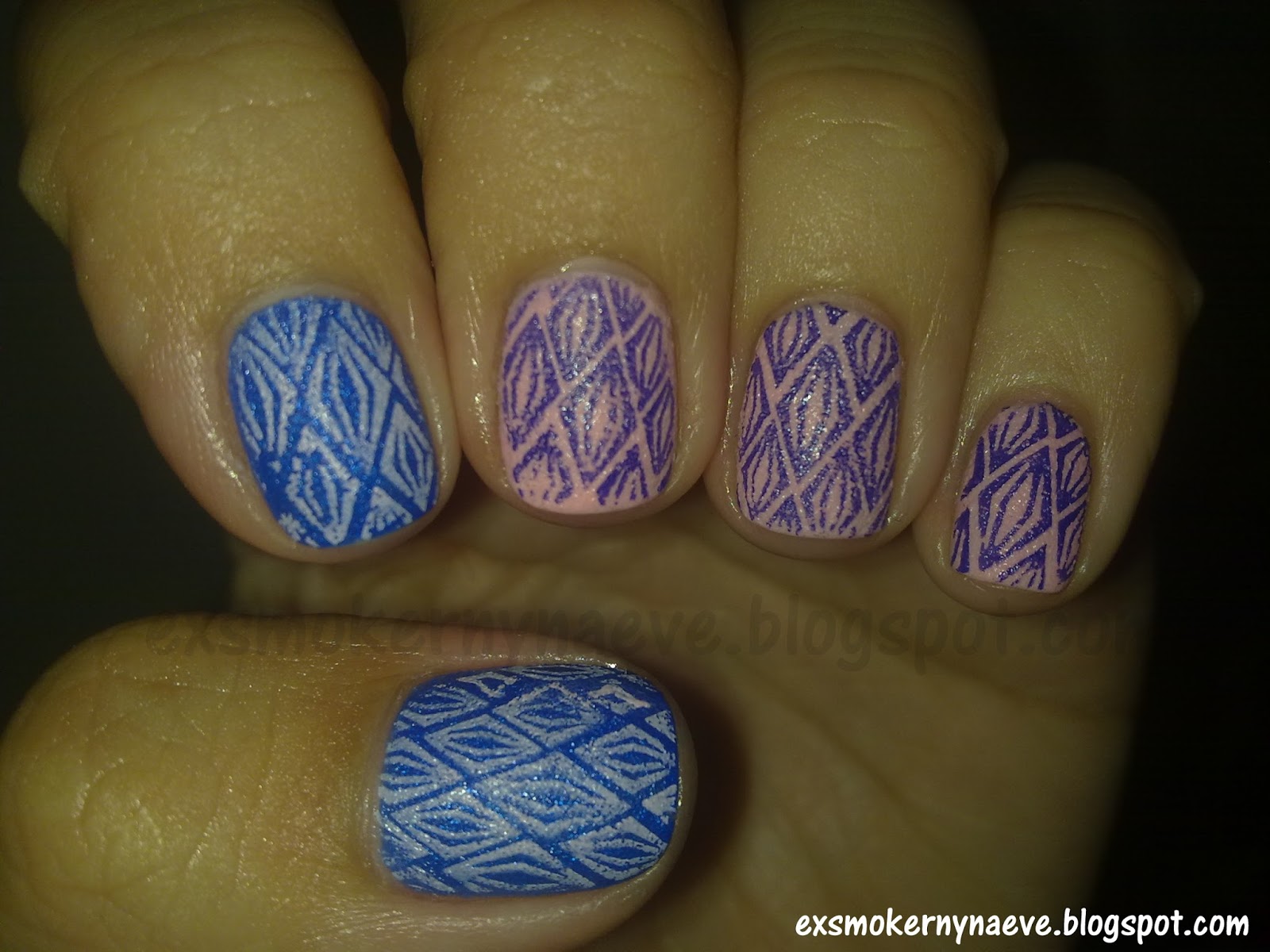 I've used this nail polish recently and stamped over it using Konad image plate s17. Also I've tried for the first time one type of gradient that I've seen in one of the videos in this YouTube channel - click. I've put in one of the image corners the dark pink and in the other corner I've put the light pink and then I've scraped several times so the colors blend. The dark pink is from Konad and the light pink is my German special polish for stamping.